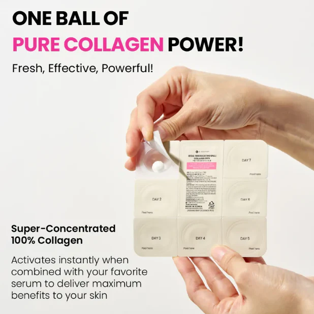 K-SECRET Boosting Ball Collagen 100% (7 kapsulas)  inovatīvs koncentrāts ādas kopšanai, kas radīts, lai cīnītos pret novecošanās pazīmēm un elastības zudumu. Formula sastāv no 100 % hidrolizēta kolagēna, kas nodrošina spēcīgu ietekmi uz ādas elastību, blīvumu un tekstūru.
