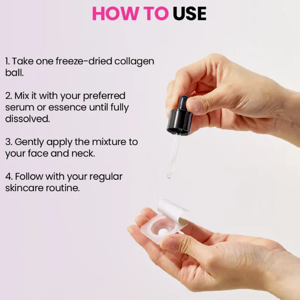 Sublimācijas tehnoloģija (freeze-dry) saglabā kolagēna aktivitāti līdz lietošanas brīdim, bet izmantošana kapsulas lodītes veidā ļauj aktīvajai sastāvdaļai “atklāties” tieši sajaucot ar jūsu iecienīto serumu vai toniku.
